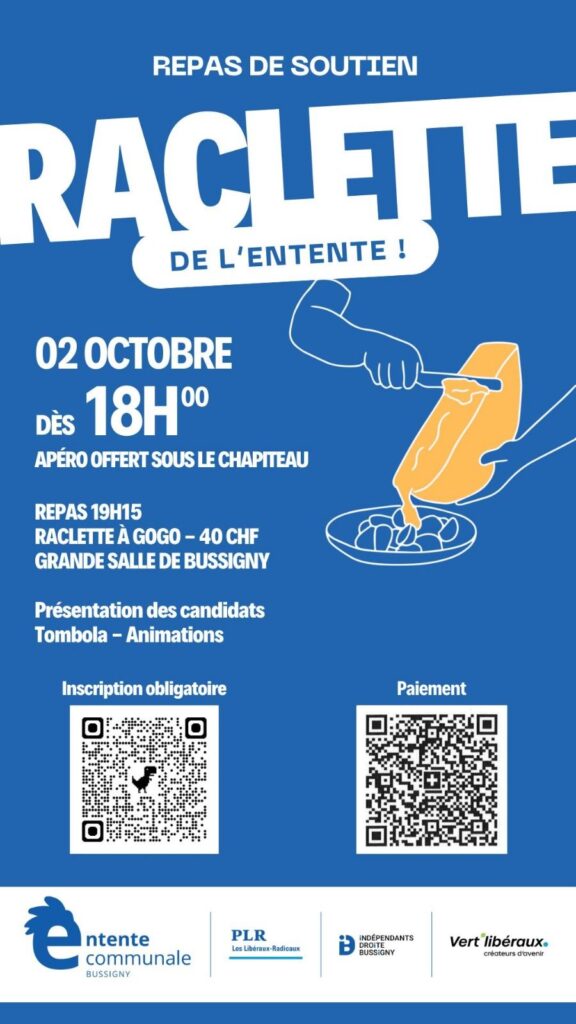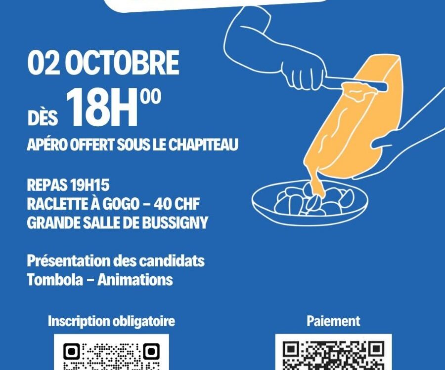 Une soirée conviviale autour d’une raclette géante organisée par l’Entente Centre droite de Bussigny. Date et horaire : Lieu : Grande Salle de Bussigny Menu : […]