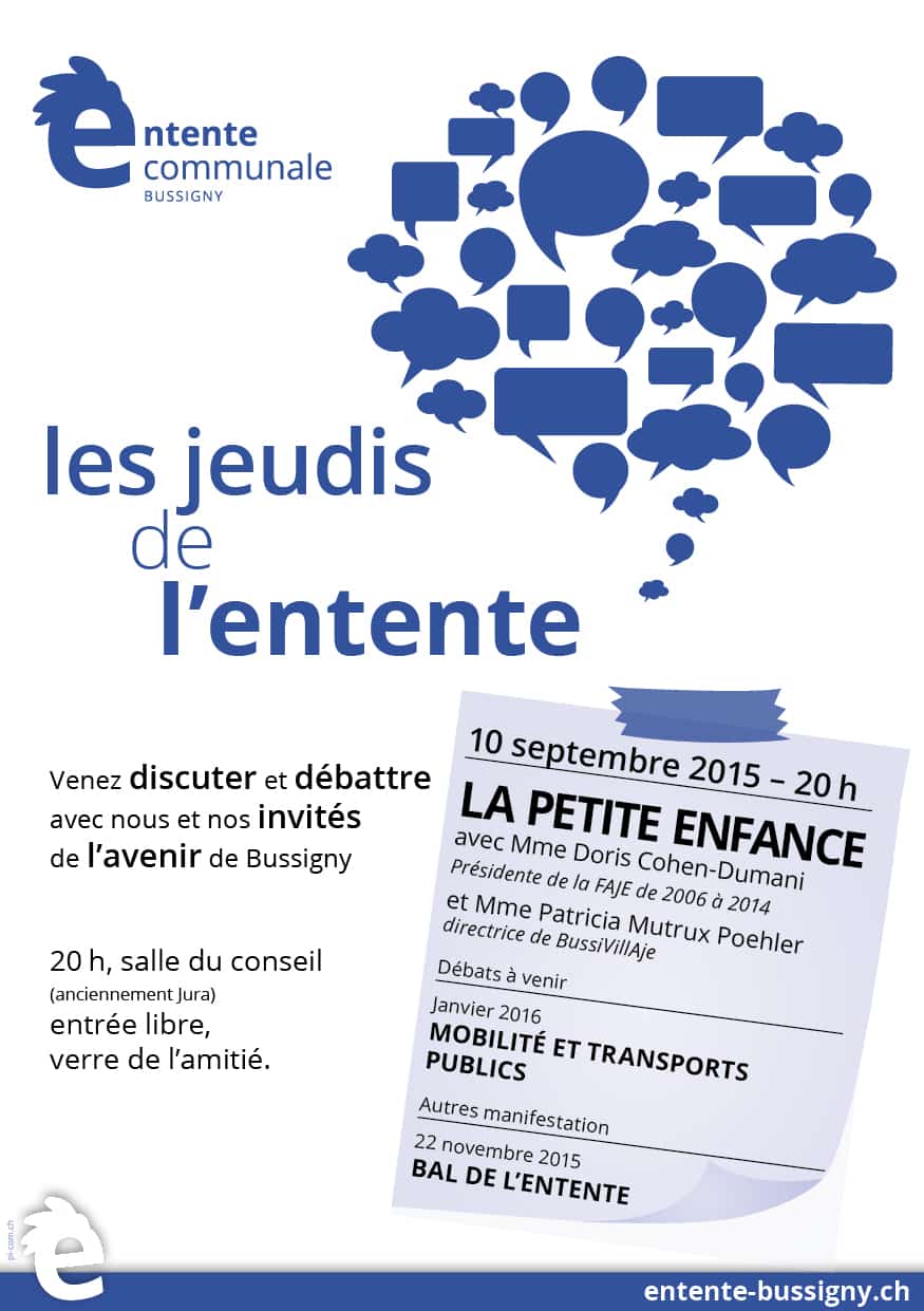 Le 10 Septembre 2015 à 20h à la salle du Conseil, nous organisons pour la 2ème fois les jeudis de l’Entente. Venez discuter et débattre de « la Petite Enfance » avec nous ainsi que Mme Doris Cohen-Dumani (Présidente de la FAJE de 2006 à 2014) et Mme Patricia Mutrux Poehler (Directice de BussiVillAje).